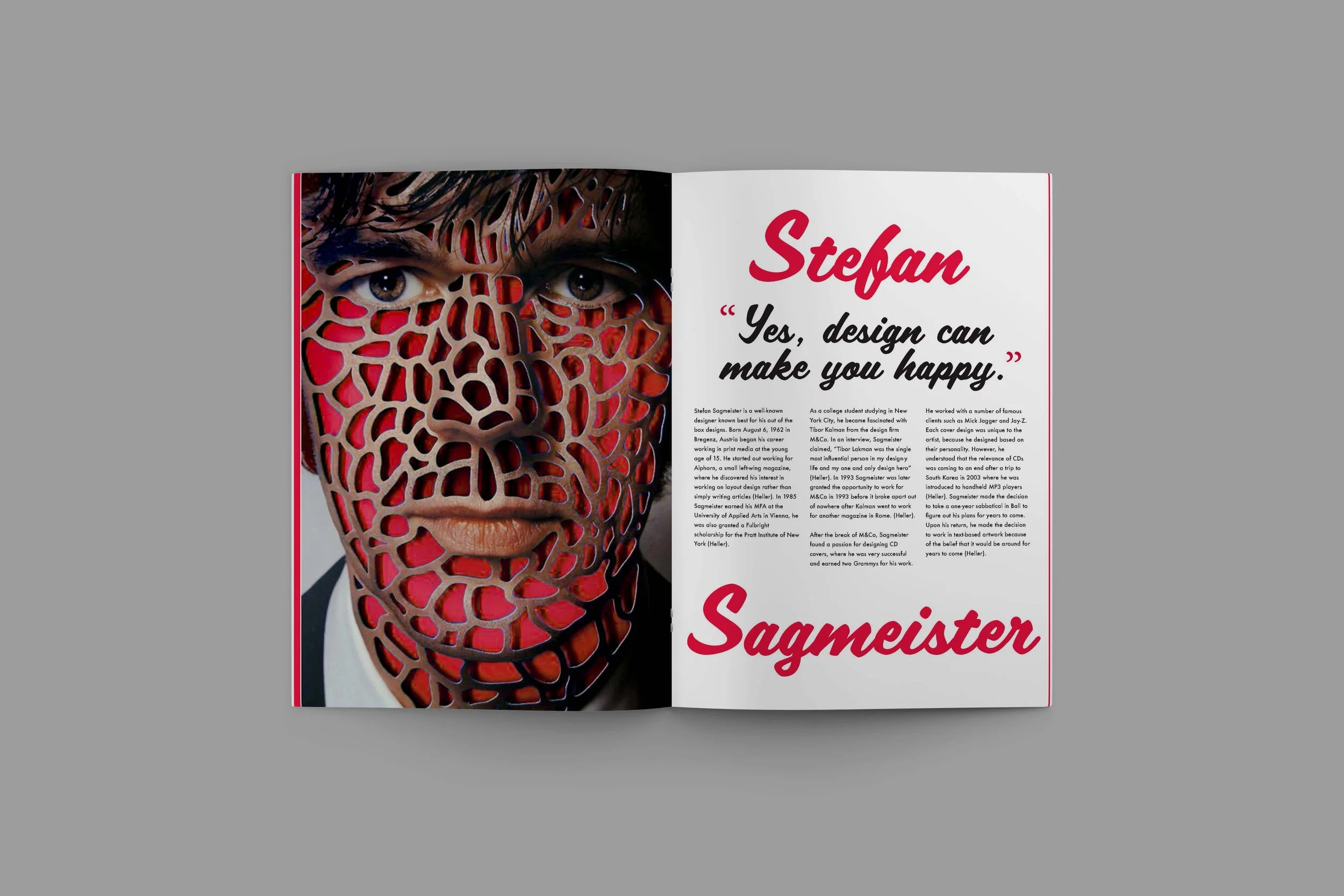 For this project, I was tasked with researching the graphic designer, Stefan Sagmeister. After researching, I wrote a spotlight piece that outlined his life and experience with design.